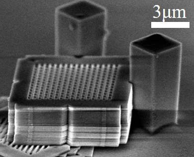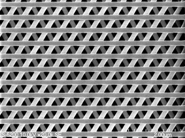 この三次元フォトニック結晶のサイズは、髪の毛の太さの100分の1程度であり、肉眼ではまともに見ることができません。