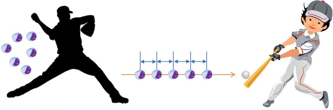 ピッチングマシーンは全ての球を、一定間隔をあけながら同じスピードでバッターボックスに届け続けます。