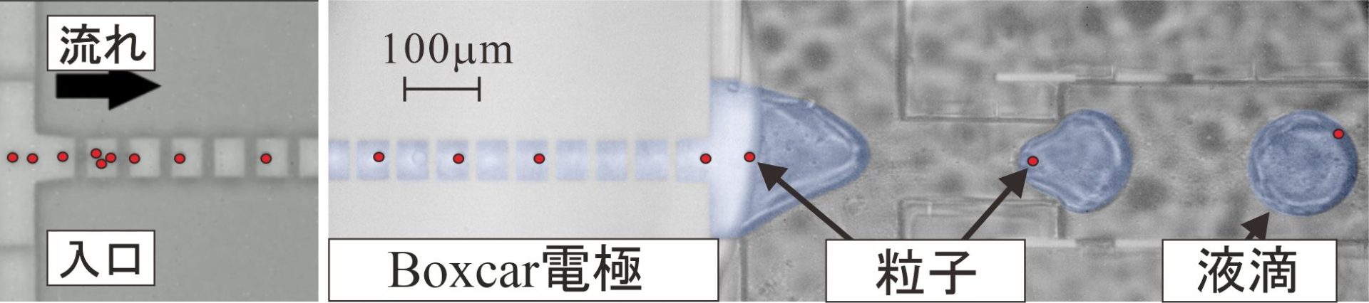 等間隔をあけながら、高速で粒子や細胞がカプセル化機構に届けられていることが分かると思います。これにより、1つ1つが液滴でカプセル化できます。