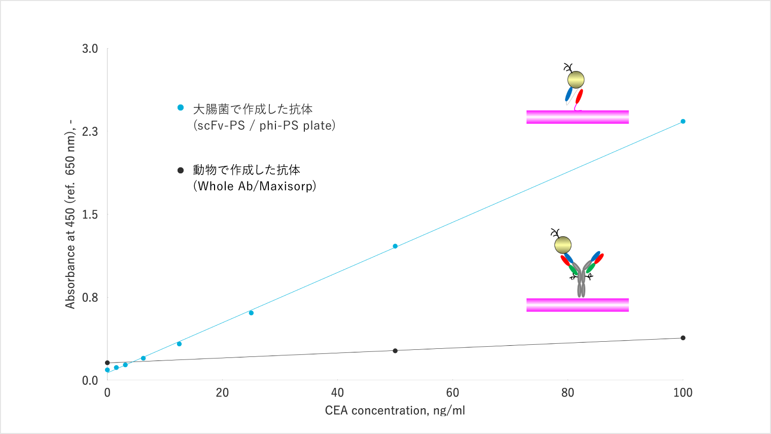 黒線は動物から作られたこれまでの抗体、青線は私が研究をおこなっている大腸菌から作られた抗体を使った結果です。縦軸が抗体のパフォーマンスだとすると、動物由来の抗体と大腸菌由来の抗体では10倍以上、パフォーマンスに開きがあることがわかります。