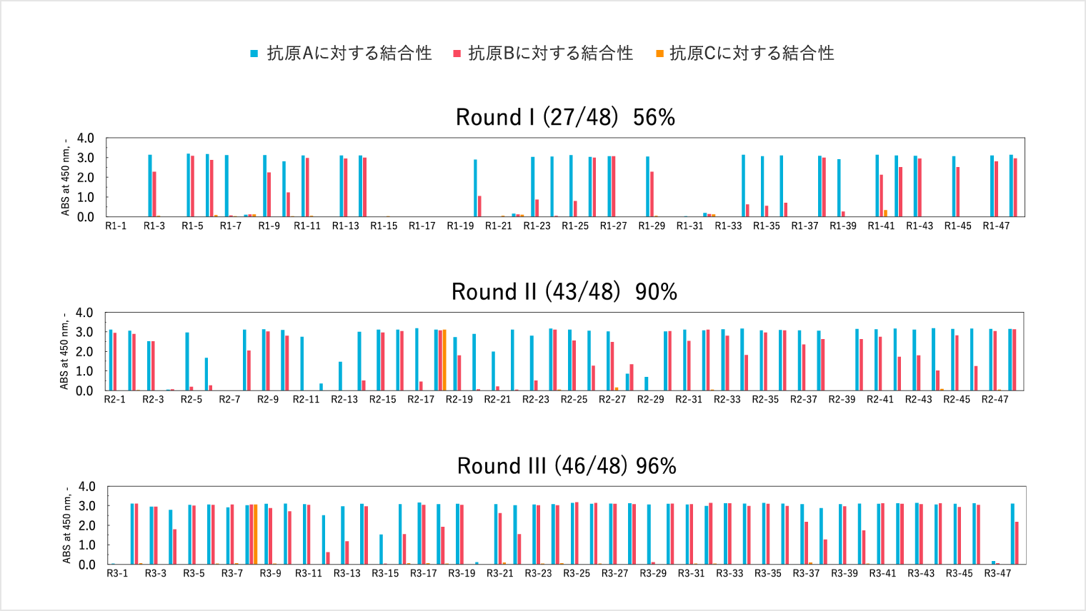 なんと、この3つの抗原をキャッチする抗体が結合力のランキングで1位になったのです。検査において非常に高い結合力を発揮する抗体だということです。