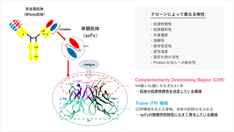 たとえばフレーム部分ではなく、結合部を入れ替えれば結合する抗原を変えることができ、別の検査薬へと変えることすら可能になります。私たちの抗体への理解度とアイディアしだいで、理想の抗体をどんどん生み出せますし、そのパフォーマンスも更新し続けられるということです。