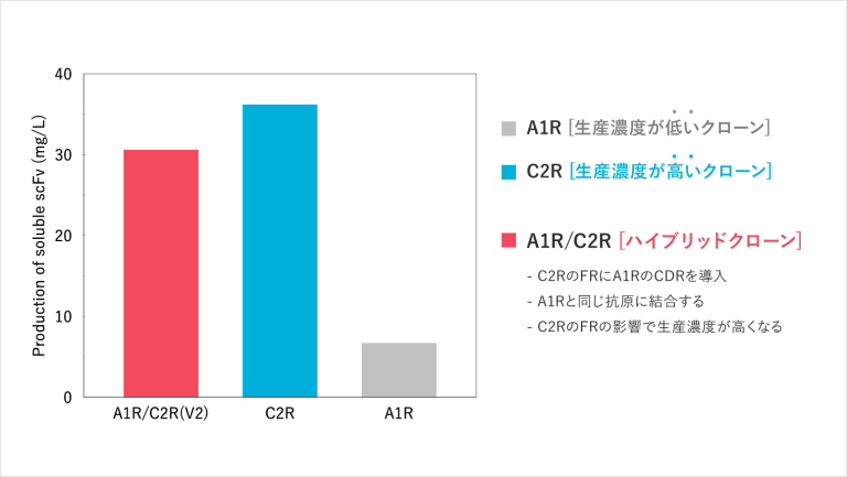 その結果、新たに生み出された抗体が一番左にある抗体A1R/C2Rです。いかがでしょうか。最初の抗体A1Rに比べて生産能力が飛躍的に向上していることがわかります。抗原と結合する能力はそのまま維持し、フレームだけを別の抗体のフレームに取り替えることで、生産能力を5倍以上伸ばすことに成功しています。