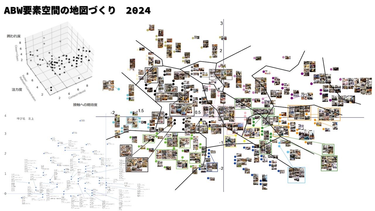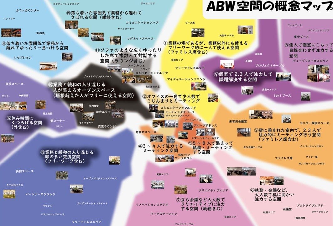 事例を統計的な手法を使って分類していくと、やがて大きなカテゴリーが生まれ、それらが大陸のように形成されていきます。そして完成したのが、この「ABW空間の概念マップ」です。 このマップは、用途ごとに大陸が分かれており、それぞれの大陸の中に、その用途に適した事例が整理されています。