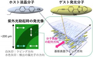 「液晶」は、分子が配列秩序性と流動性を兼ね備えた固体と液体の中間のような状態を指し、この性質が液晶ディスプレイ技術を支える鍵となっています。私たちは、液晶分子とよく混和し、高効率で発光する有機分子を開発しています。開発した発光分子/液晶分子の混合材料は、液晶の配列に沿って配列した発光分子が偏光発光するため、紫外光を照射しながら偏光子を通して見ることでのみ情報が読み取れるセキュリティ素子や、自発光ディスプレイ、液晶レーザー等の応用を見据え研究を進めています。